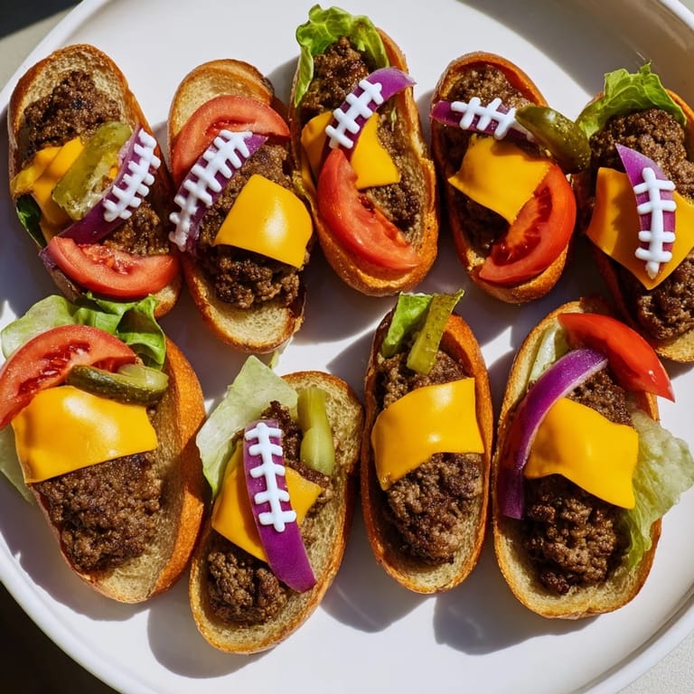 Save A playful and hearty platter featuring mini burgers shaped like American footballs—perfect for game day gatherings or themed parties.