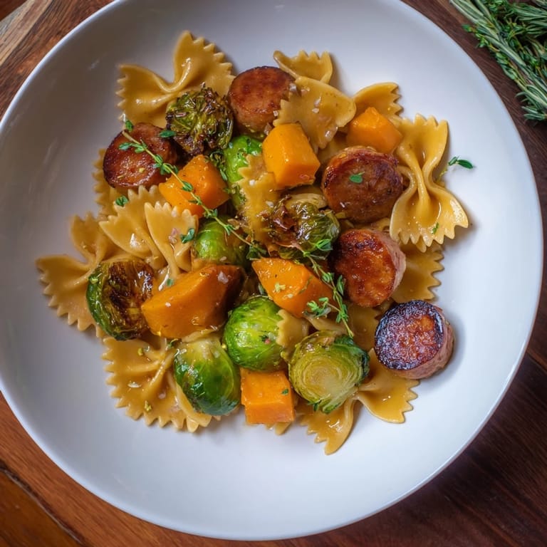 Save A cozy, flavorful one-skillet meal featuring bow tie pasta tossed with smoked sausage, roasted butternut squash, and Brussels sprouts in a rich garlic butter sauce—a perfect celebration of falls best ingredients.