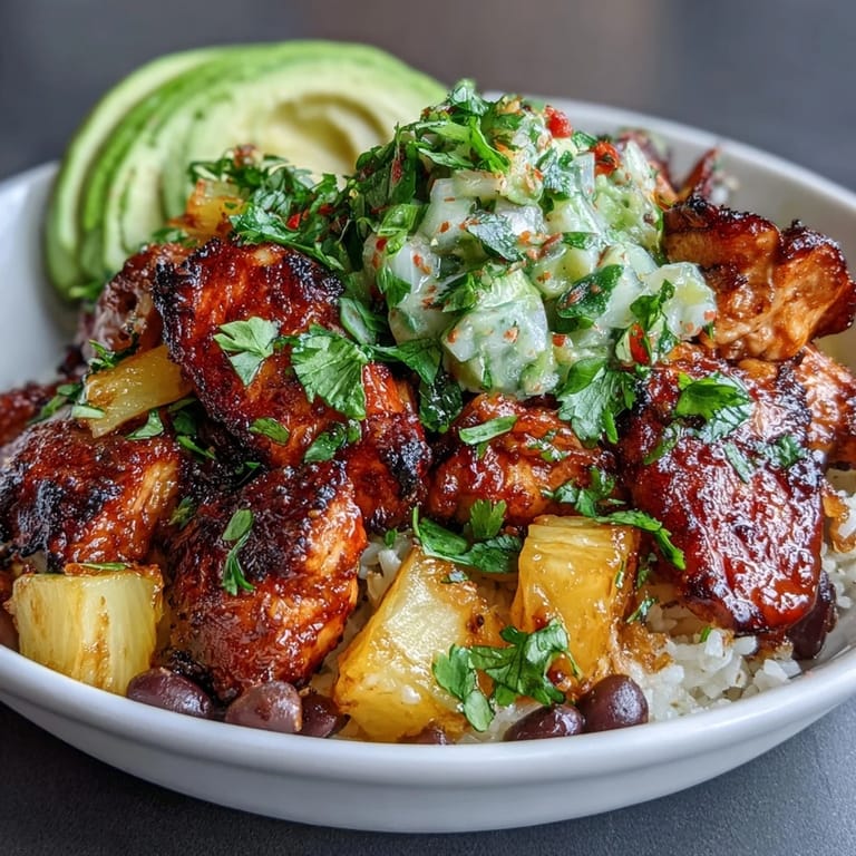 What makes this bowl work is the conversation between sweet, spicy, and bright—the pineapple's natural sweetness plays against the warm, slightly smoky spices on the chicken, while the lime juice and jalapeño in the salsa keep everything sharp and alive. The creamy coconut rice acts as a gentle mediator between all these bold flavors, creating a bite that tastes sophisticated even though you're eating with a fork from a bowl. This balance is what keeps you coming back for another spoonful instead of being satisfied halfway through.