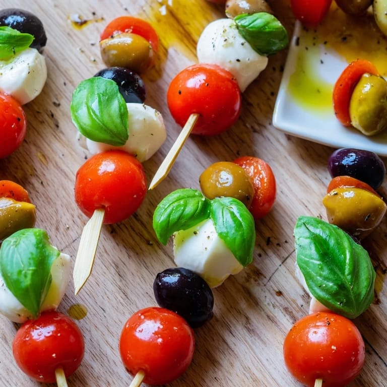 - Other: 16 small pretzel sticks or wooden cocktail skewers 2 tbsp extra-virgin olive oil 1 tsp balsamic glaze (optional) Freshly ground black pepper, to taste