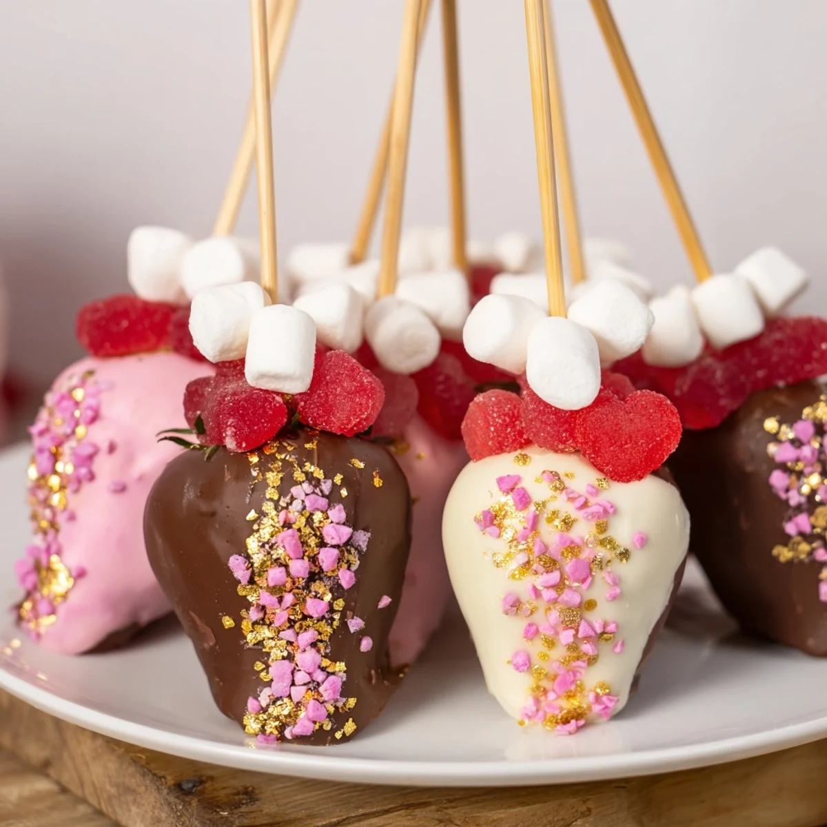 Save A festive and playful candy assortment featuring heart-shaped treats and chocolate-dipped strawberries, perfect for Valentines Day or romantic celebrations.