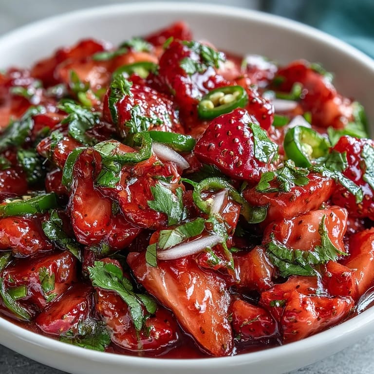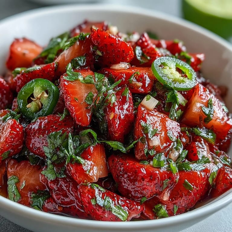 Save My neighbor showed up at my door one summer afternoon with a container of the most beautiful strawberry salsa I'd ever seen, the berries still glistening with lime juice. She'd made it for a fish taco dinner and had extra, and watching me taste it, she laughed because apparently my eyes went wide. That single spoonful—bright, sweet, with just enough jalapeño heat to make you notice—changed how I thought about strawberries in savory cooking. Now I make it constantly, especially when I need something that feels fancy but takes barely any effort.