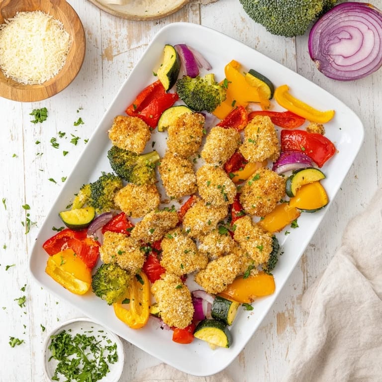 Save Juicy chicken bites tossed with garlic, Parmesan, and herbs, roasted alongside colorful vegetables for a quick and flavorful one-pan meal.