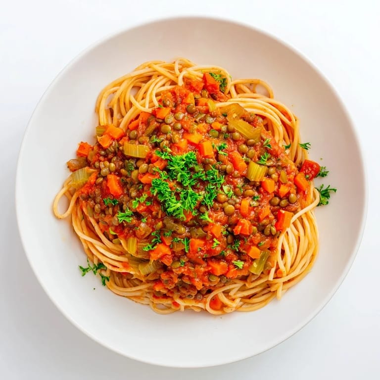 - Serve lentil Bolognese over pasta. Garnish with fresh parsley or basil.
