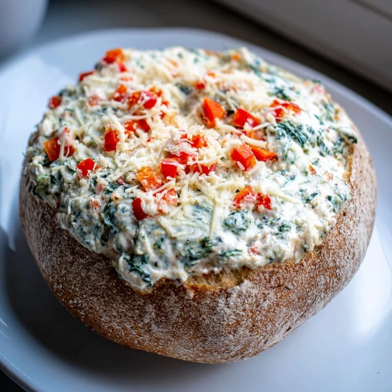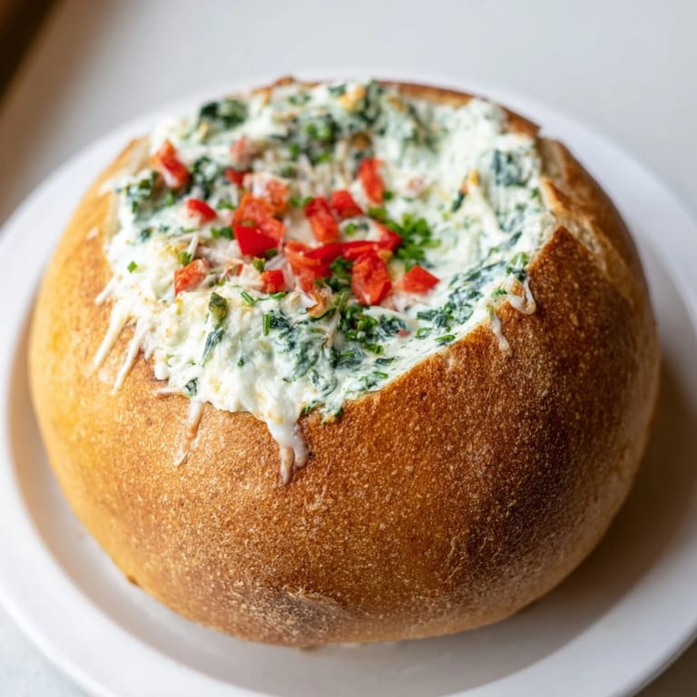 Save A festive, creamy spinach dip served in a warm, crusty bread bowlβperfect for holiday gatherings and quick to prepare.
