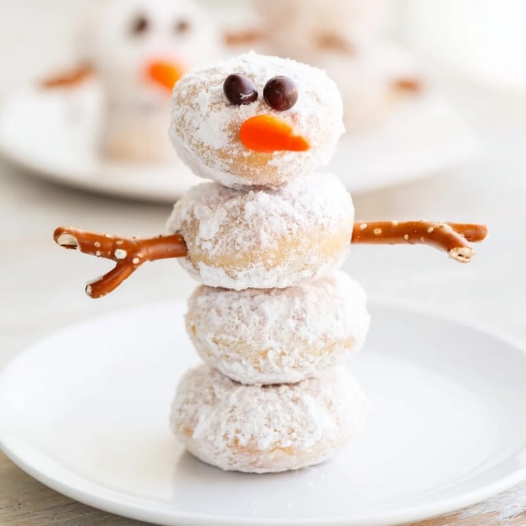 Save Adorable and fun mini donut snowmen stacked on skewers—a perfect, no-bake winter snack for kids parties or holiday treats.