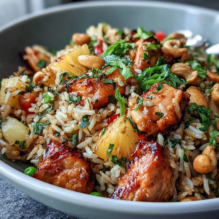Save There's something irresistibly joyful about a dish that brings together sweet pineapple, savory chicken, and the satisfying crunch of roasted cashews in one vibrant bowl. This Pineapple Chicken Fried Rice is a celebration of contrasts—tender jasmine rice kissed with soy and sesame, bright vegetables that pop with color, and juicy pineapple chunks that surprise your palate with every bite. It's the kind of meal that transforms leftover rice into something extraordinary, proving that weeknight dinners don't have to be ordinary. Whether you're craving the bold flavors of Asian-inspired cuisine or simply need a quick, nourishing meal that the whole family will love, this fried rice delivers on every front.
