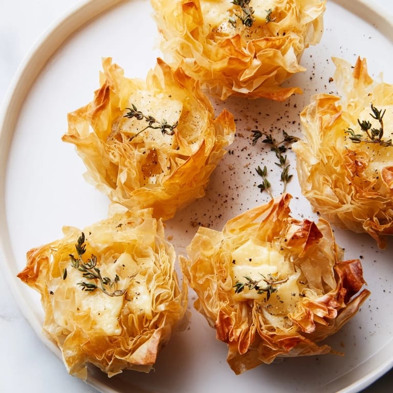 Sometimes I dust the phyllo with a pinch of herbes de Provence before baking, which transforms the entire character without overwhelming anything—suddenly it tastes like it was made for a summer garden party instead of a winter gathering. Other times I keep it pure and let the cheese take center stage. I've learned that honey doesn't have to be a finishing flourish; a very subtle amount mixed into the melted butter before coating the phyllo adds a whisper of sweetness that nobody can quite identify but everyone notices. The thyme and pepper aren't just garnish either; they complete a flavor story that moves from crispy to rich to herbal, with pepper as the final punctuation.