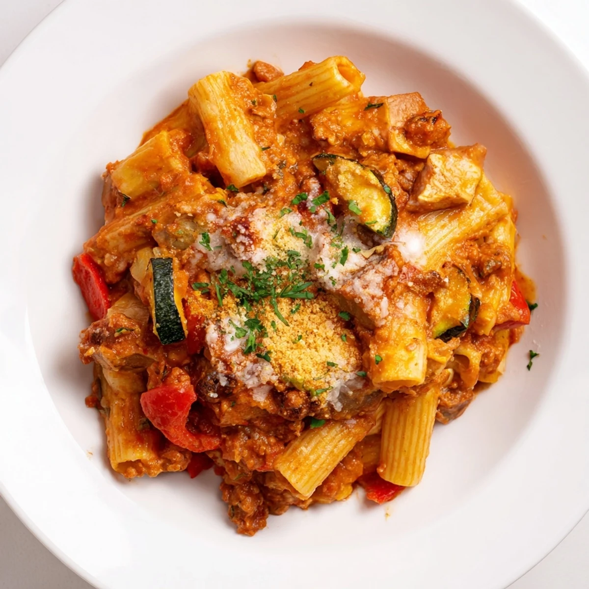 Save A hearty, flavor-packed pasta bake featuring spicy vegan chorizo, roasted vegetables, and a creamy tomato sauce, perfect for a comforting plant-based meal.