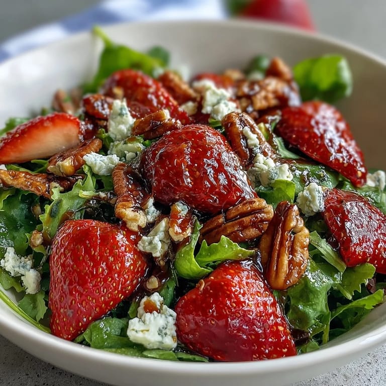 This salad shines as a starter for spring dinner parties or as a light main course for lunch. Serve it on chilled plates to keep the greens crisp, and add the balsamic glaze at the last moment to maintain the vibrant colors. Pair it with a crisp Sauvignon Blanc or sparkling rosé to complement the strawberries and balance the tangy dressing. For a complete meal, serve alongside crusty artisan bread or garlic crostini. The salad also works beautifully as part of a larger spread with grilled proteins or seasonal vegetable dishes.
