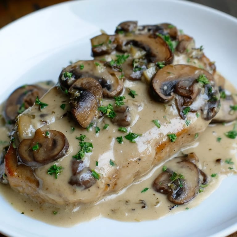 - Mushroom Sauce: 1 (10.5 oz / 300 g) can condensed cream of mushroom soup, 1/2 cup (120 ml) low-sodium chicken broth, 1/2 cup (120 ml) heavy cream, 1 small onion (finely chopped), 8 oz (225 g) cremini or white mushrooms (sliced), 2 cloves garlic (minced), 1 teaspoon dried thyme (or 1 tablespoon fresh, chopped), salt and black pepper to taste, 1 tablespoon fresh parsley (chopped, for garnish)