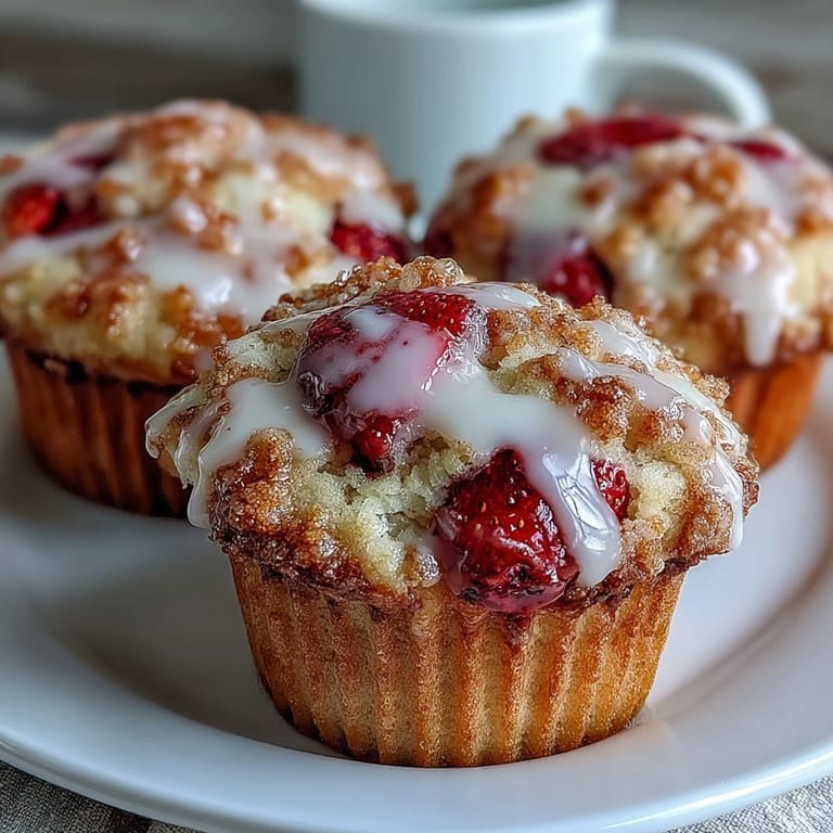 Save There's something about the smell of strawberries baking that stops me mid-morning and reminds me why I bother with the kitchen at all. My neighbor knocked on the door once while these were in the oven, and the aroma hit her before I even opened it—she asked what magic was happening in my kitchen. These muffins emerged golden and tender, studded with bursts of fruit and finished with a glaze so bright it practically glowed. They've become my answer to almost every question: breakfast? Bake these. Need to bring something to share? These muffins. Want to feel like you actually have your life together on a Tuesday morning? These.
