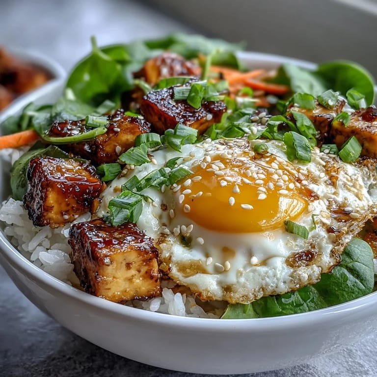 I've eaten this for breakfast, lunch, and honestly even a light dinner when I didn't have energy for anything complicated. The ratio of rice to protein to vegetables stays satisfying no matter what time you break the yolk into it. Swap the greens for whatever raw vegetables you have—roasted mushrooms, avocado, shredded beets—and it's still the same bowl, just different every time.