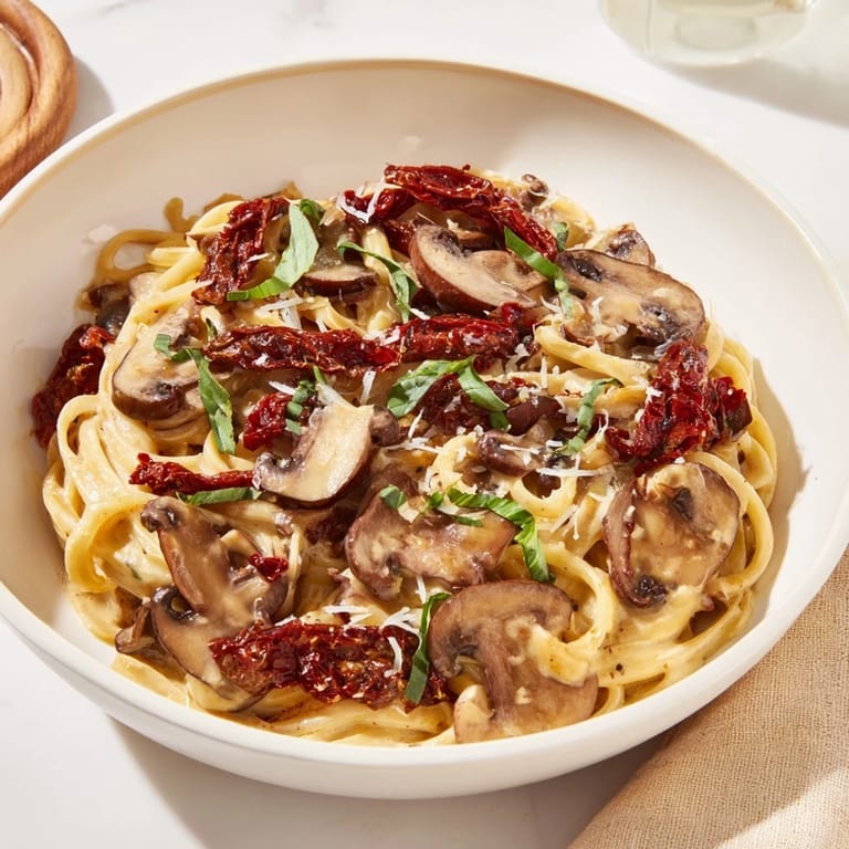 Save A creamy, flavorful vegan pasta dish featuring tender mushrooms and sun-dried tomatoes in a luscious, dairy-free sauce—so delicious, you might just propose!